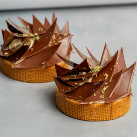 This elegant tartlet combines exotic flavors with a creamy texture. It features a sweet pastry base, caramelised bananas, a vanilla mascarpone cream, coconut whipped cream, and a milk chocolate namelaka made with Tannea 43%.