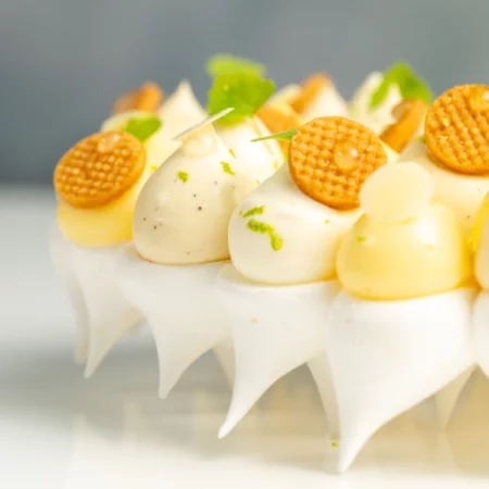 Julien Dugourd reinvents the lemon tart with a airy and stunning twist! Built on a base of delicate meringue, the Chef pipes a lemon cream, a lemon confit, and a white chocolate Diapason 33% whipped ganache infused with lemon thyme.
