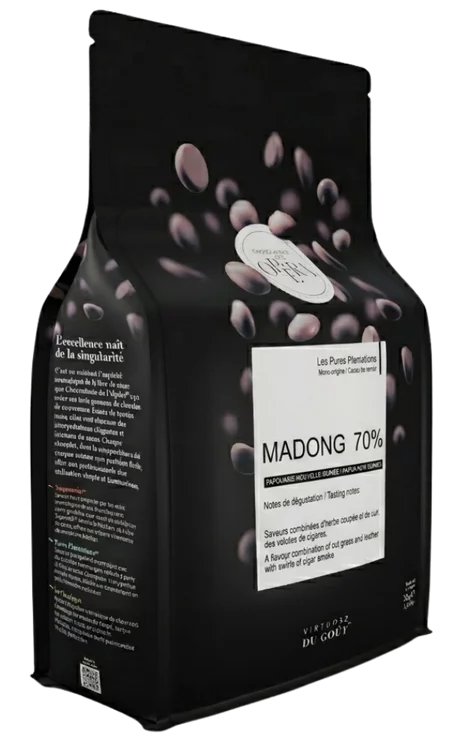 Madong 70% is truly unique in the couverture market with a surprising almost meaty chocolate from volcanic land. The flavour of fresh-cut grass and leather mingles with cigar smoke.