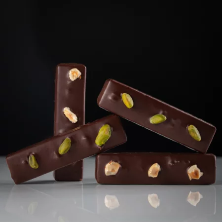 De délicieuses barres chocolatées composée d'une guimauve chocolat et d'une couche de praliné. Pour cette recette, le chef nous propose deux déclinaisons avec notre Praliné Noisettes 50% texture artisanale et notre Praliné Pistaches 60% texture lisse.