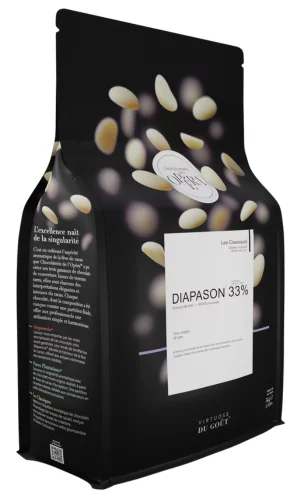 Diapason® 33% est un chocolat à la couleur blanc polaire. Peu sucré mais très gourmant, possèdant une palette aromatique vanillée très équilibrée. Son taux élevé en beurre de cacao lui confère une fluidité idéale pour les moulages et les enrobages.