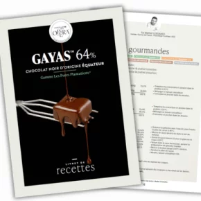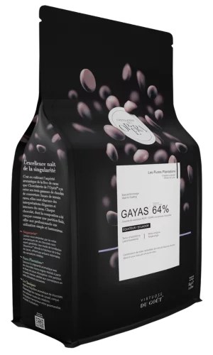 Si sa composition permet tous types d'usage, Gayas 64% a été conçu pour parfaire les enrobages. Avec un taux de beurre de cacao de 37%, sa fluidité permet d'obtenir une couverture précise d'une belle couleur marron ambré. Sa palette aromatique est riche et cacaotée.
