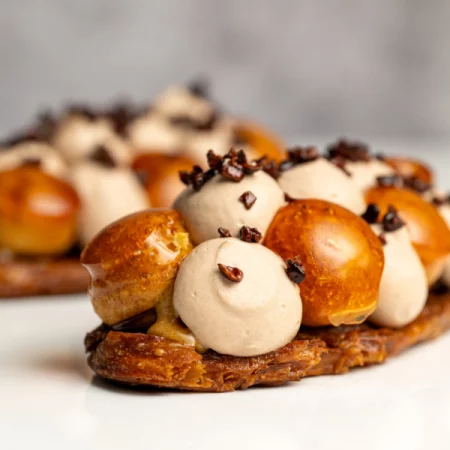 A timeless classic, elegantly reimagined by Julien Dugourd. This contemporary Saint-Honoré features caramelised choux filled with chocolate cream, accompanied by delicate domes of Carupano 62% chocolate-coconut whipped cream and chocolate cream.