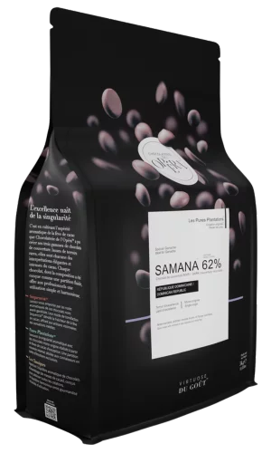 Cette déclinaison en 62% du chocolat Noir Samana 70% dispose des mêmes notes aromatiques (épicées et fruits rouges). Mais sa composition diminuée en beurre de cacao est idéale pour les ganaches et les mousses.